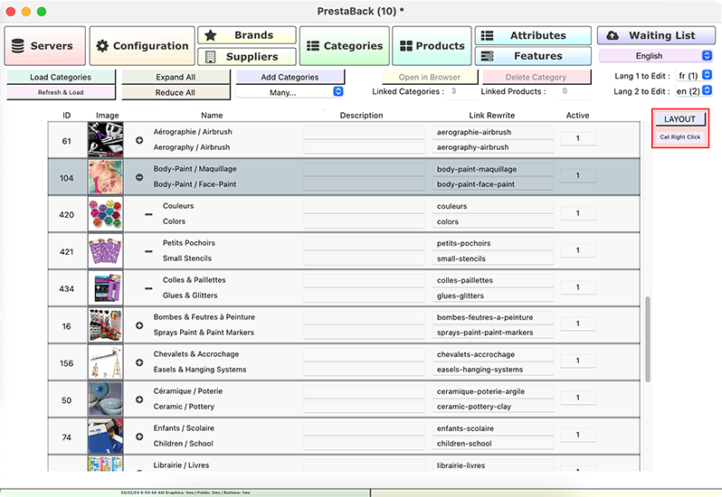 Navigate the complete category tree with hierarchical display. Edit names, descriptions, and SEO meta in all languages. Reorganize category positions and manage product-category associations directly from the grid.